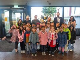 Dafür haben Kinder der Johann-Wallraf-Schule den Weihnachtsbaum in der Bürgerhalle geschmückt.